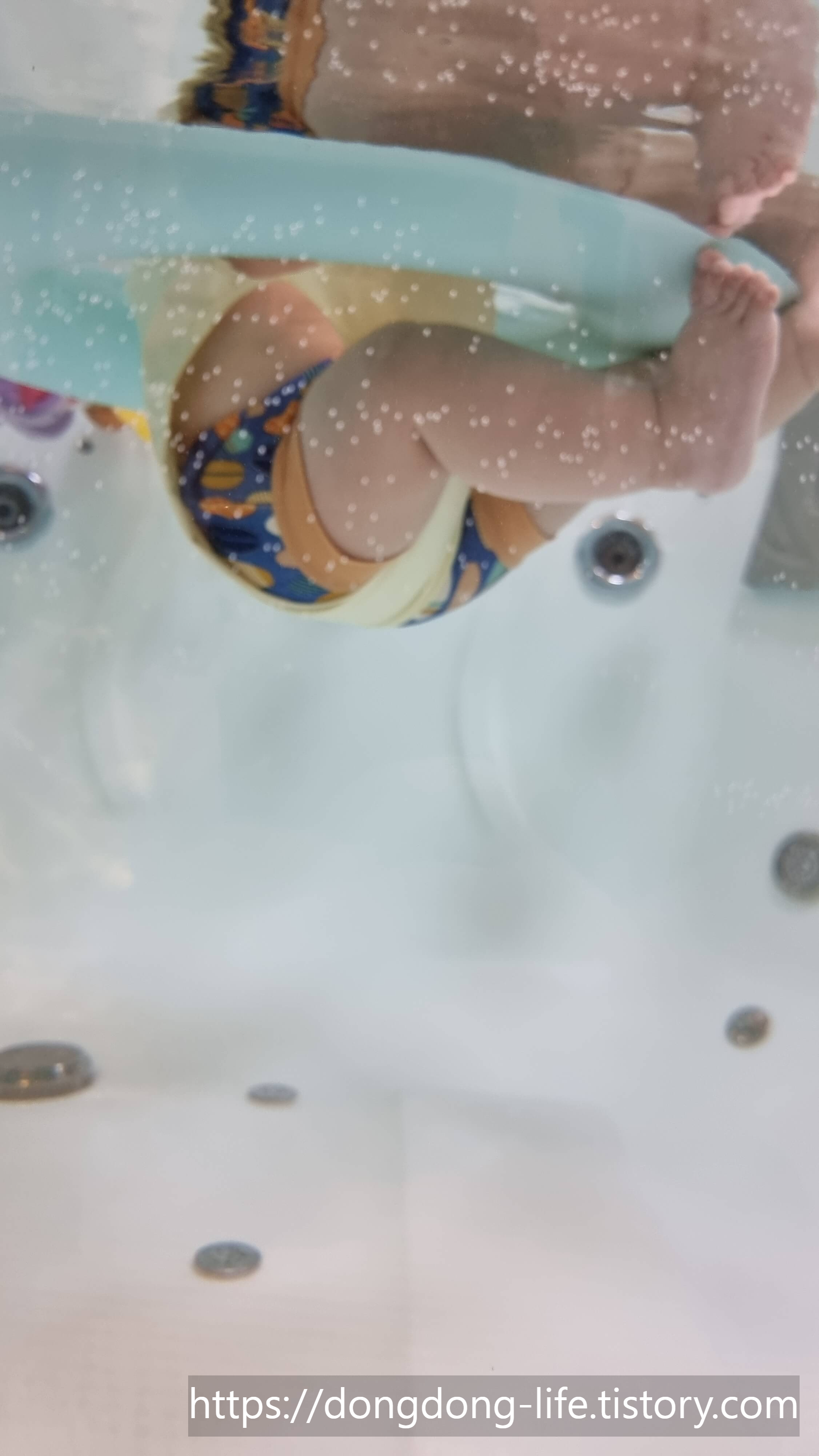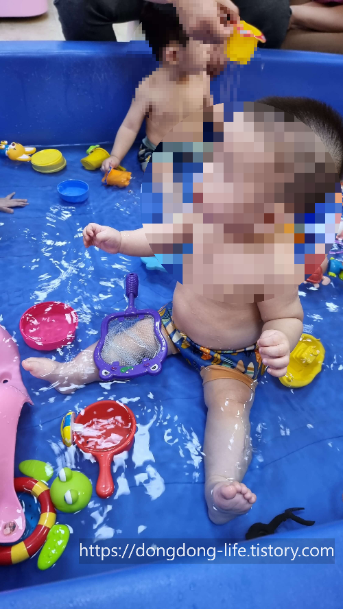 장난감도 만져보고 작은 샤워기로 물을 만지면서 어느 정도 적응이 완료되면 대형풀 속으로 들어간다!