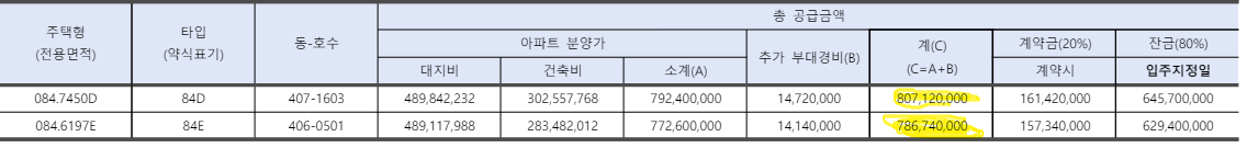계약금 20%로 1억 6천 정도의 자금으로 청약이 가능하며 잔금은 계약서를 작성한 날로부터 약 2달 내에 입주해야 하므로 잔금일정이 빠듯한 편입니다.