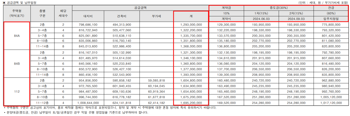 계약시 분양가의 10%를 계약금으로 납부, 중도금은 30%로 각 15%씩 2회에 걸쳐 납부합니다. 중도금대출은 가능할 것으로 보입니다. 잔금은 나머지 60%이며 분양 아파트이므로 집단대출로 실행할 것으로 예상됩니다.