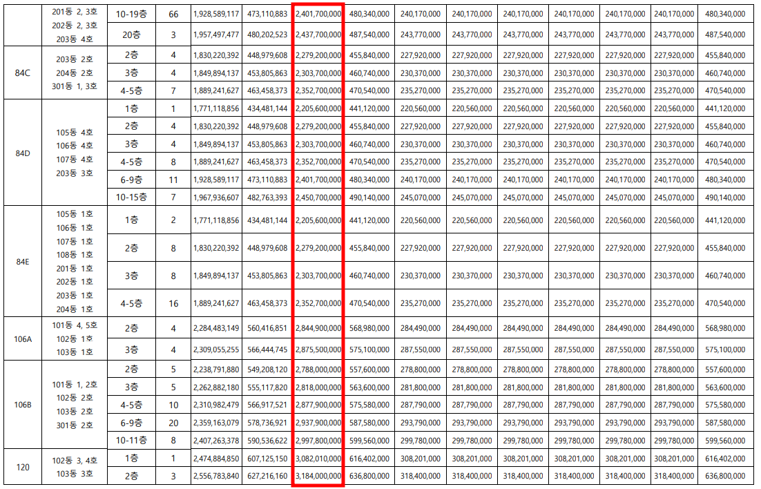 전용면적 25평인 59사이즈부터 120타입까지 분양가를 표로 한눈에 보시기 바랍니다. 래미안 원페를라는 후분양 아파트로 청약과 입주가 같은 해에 진행됩니다. 중도금, 잔금 일정이 다소 빠듯하여 표에 납부 일정도 파란색으로 표시했으니 꼭 확인하세요.