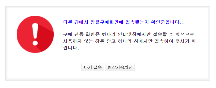 예매하는 사이트는 인터넷 창 하나에만 열어둡니다. 창을 중복하여 열어 두고 예매는 불가합니다. 만약 코레일 사이트 내에서 새로고침을 하면 위의 창이 뜨면서 몇 초간 시간이 딜레이 되고, 그러면 1초가 아까운 시점에 예매 실패 확률은 올라가겠죠? 새로고침은 하지 않도록 합니다.