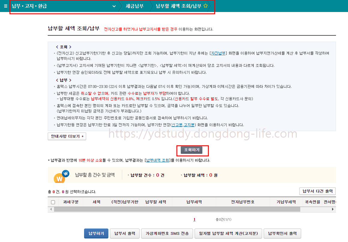 세금 납부 사이트인 '카드로택스'사이트 또는 '인터넷지로'사이트에서 로그인 후 납부하실 수 있습니다. 마찬가지로 공등인증서 또는 금융인증서로만 로그인해야 납부가 가능하며, [국세] - [조회납부] - [납부하기] 클릭하여 결제하시면 됩니다. 이용시간은 00:30~23:30이며 은행 계좌이체의 경우에는 일부 은행에서 7:00~23:30에 납부 가능합니다.