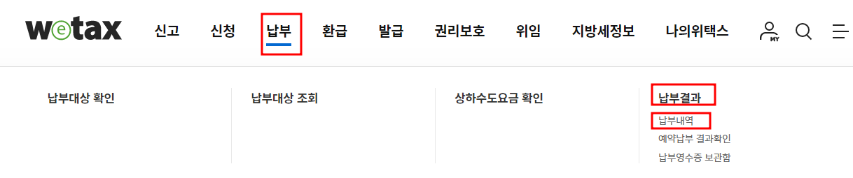 주민세 사업소분 납부 조회는 위택스 로그인 후 다음 메뉴에서 확인이 가능합니다. 납부 대상자인지도 확인 가능하니 아래 버튼을 통해 납부 대상자 조회로 확인해보시기 바랍니다. 또한 납부 후 납부가 잘 되었는지 납부내역 확인도 가능합니다.