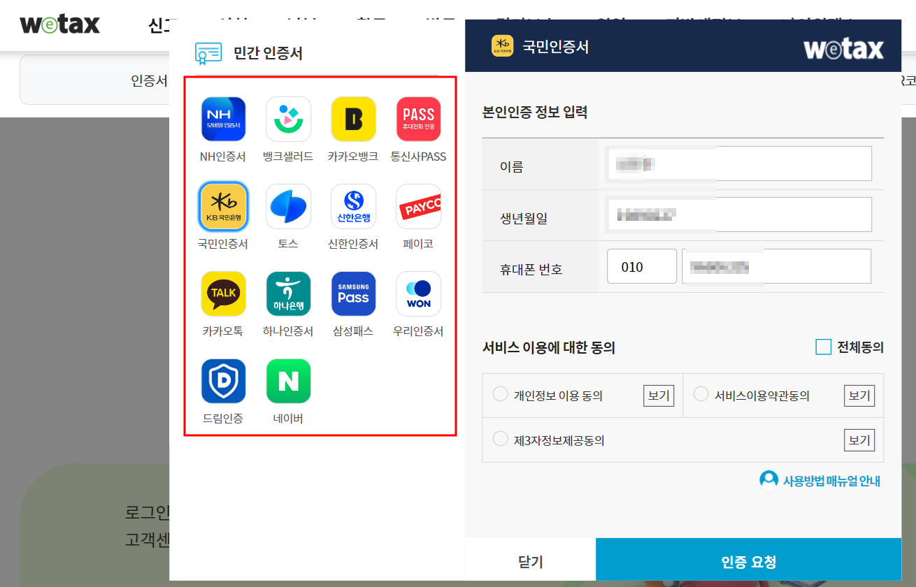 1. 위택스 홈페이지 또는 모바일앱에서 간편인증 또는 공인인증서, 금융인증서, 휴대폰 인증, QR코드 인증을 통해 로그인합니다.