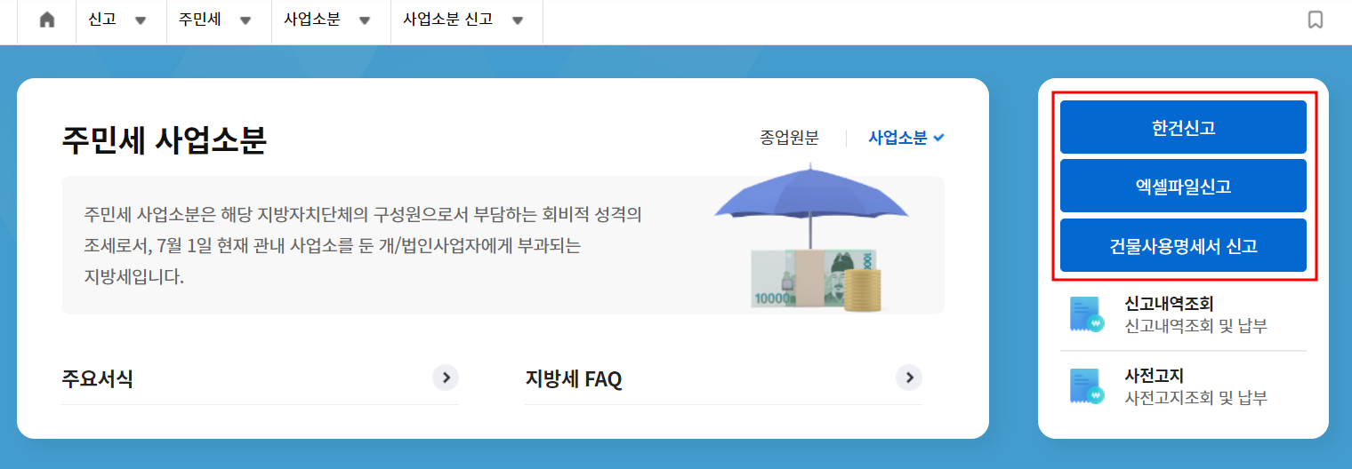 2. 로그인 후 메인 화면에서 주민세 사업소분 클릭, 또는 메뉴에서 [신고] - [주민세] - [사업소분] 클릭