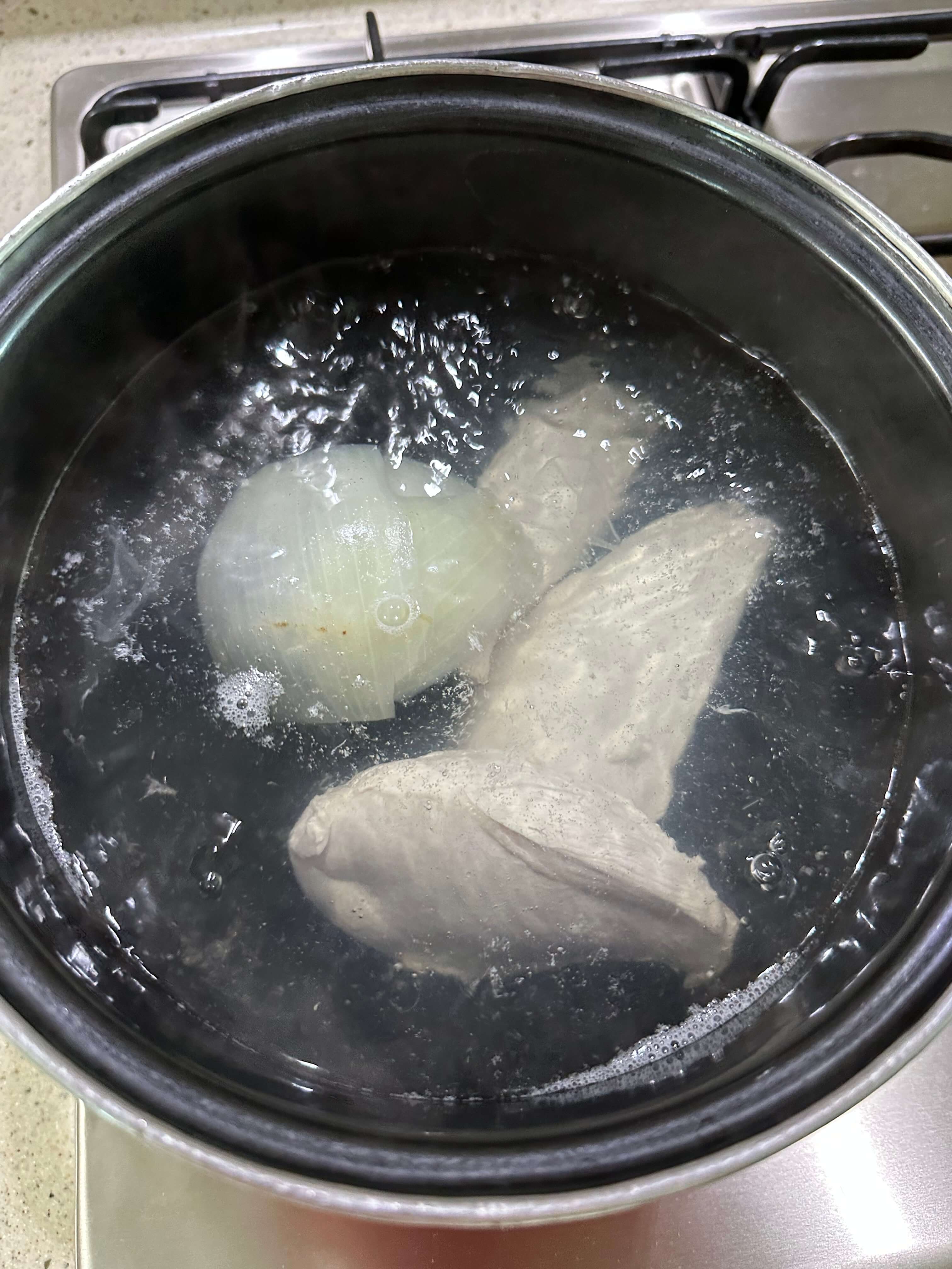 7. 양파를 건진 물에 닭고기를 넣고 20분 정도 끓인다.